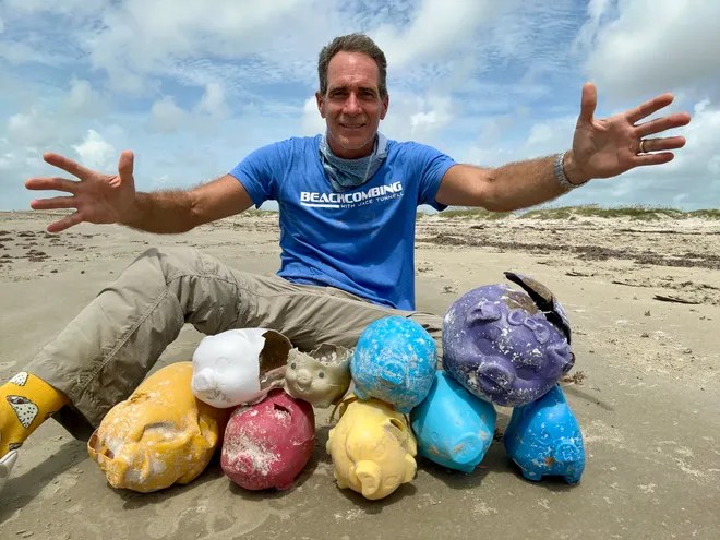 Jace Tunnell, HRI Director of Community Engagement at the Harte Research Institute, is show with colorful piggy banks that have been showing up on Texas beaches lately. Tunnell speculates that they may have come from a damaged or lost container aboard a container ship or even from Cuba. The Texas Coast gets it share of items washing up on its beaches. These piggy banks seemed to be empty.