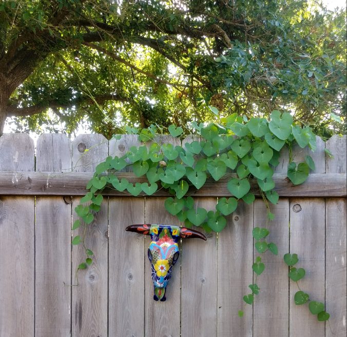 On impulse I photographed this morning glory vine and Talavera cow skull on the backyard fence of our house. The vine is from the neighbor’s yard behind us; perhaps it is seeking more sun as it gets full sun by afternoon on our side. I am waiting for it to bloom.