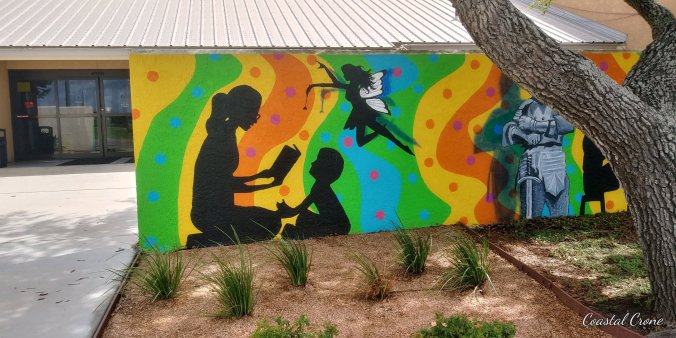 Portions of mural on the outer walls at the entrance of the local public library (Portland, Texas) by artist Cameron Walls completed in 2024.